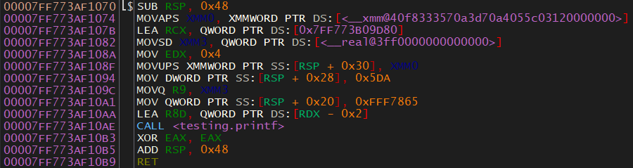 MOVUPS XMMWORD PTR SS:[RSP + 0x30], XMM0. Remember that the XMM registers can hold two values. XMM0 contains both 87.002998 and 99123.34.