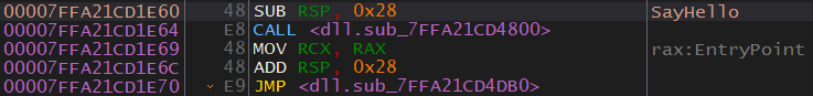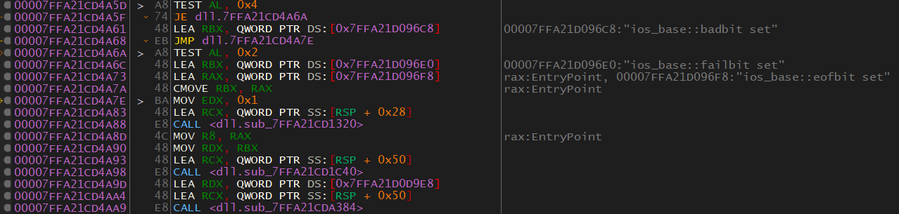 The start of the functions look almost exactly the same. At this point, we can be pretty confident that the function SayHello() is calling is std::cout. Let’s take a look at the jump instruction at the end of the SayHello() function and see what we can find there. Here is the code that is jumped to: