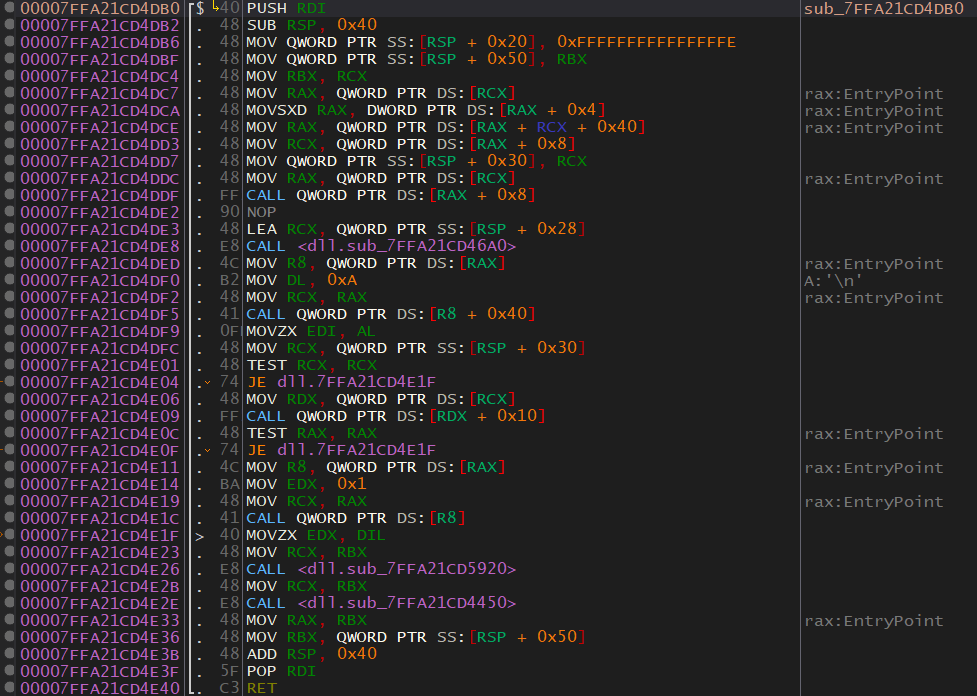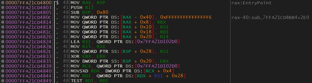 This function doesn’t seem to return anything. It calls one function and jumps to another. The first function is sub_7FFA21CD4800. This function is pretty big.