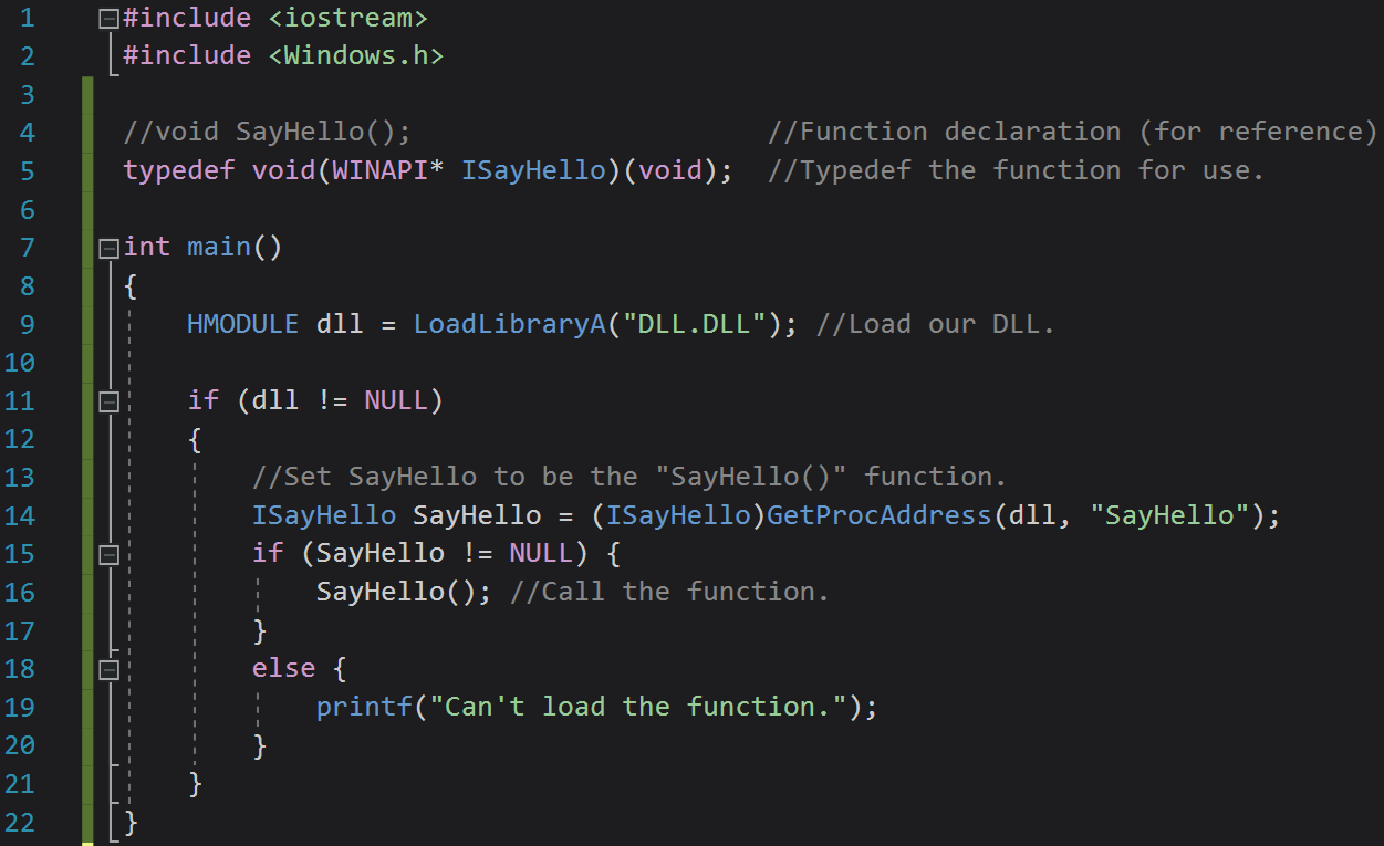 ISayHello SayHello = (ISayHello)GetProcAddress(dll, "SayHello");