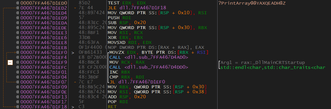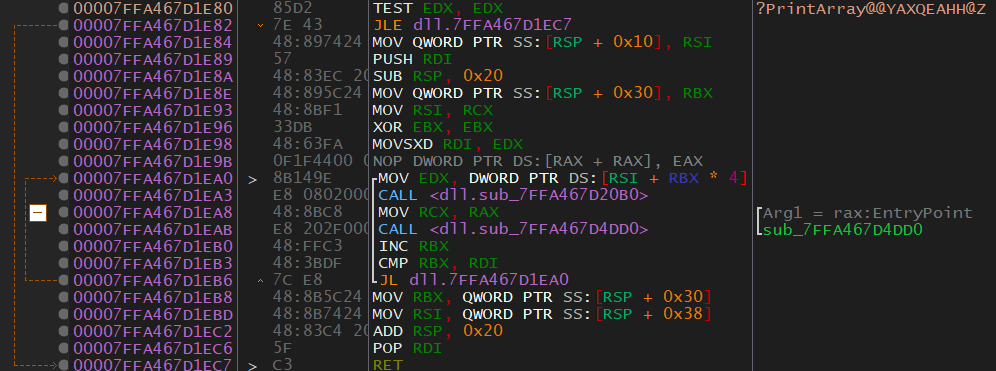 MOV EDX, DWORD PTR DS:[RSI + RBX * 4]- Whatever is in RSI + RBX * 4 is moved into EDX. RSI is our first parameter, which we know is an array (well, the address to the start of an array). RBX is zero right now. RBX is multiplied by 4 which just results in zero. For now, this seems pointless, but if you look you’ll notice that this is a loop. We’ll touch back on this again. Right now it’s just putting the first element in the array (RSI) into EDX.CALL <dll.sub_7FFA467D20B0>- Digging into this function shows, based on our previous research, that this is most likelystd::cout. Okay, but isn’t the first parameter passed through RCX, not EDX (or RDX)? If we go into the function atdll.sub_7FFA467D20B0we can see that it doesn’t actually use RCX as if it was passed as a parameter and just overrides it. It does, however, treat EDX like a parameter. I’m assuming that this is some compiler optimization.std::coutcalls a function with RCX so maybe the compiler decided to leave RCX alone when callingstd::coutso it doesn’t have to save RCX into another register. This would save a few instructions.CALL <dll.sub_7FFA467D4DD0>- Based on previous research, we can see that this isstd::endl.INC RBX- This increments RBX by one. Remember that RBX was zero and was multiplied by 4. The result of this operation was then used as an offset into our array. Now it makes sense why RBX was zero, RBX holds the iteration of the loop. RBX is then used to access the element in the array at the index of the loop’s iteration count multiplied by 4. This should make sense if you’ve ever written a program that printed an array. For every iteration of the loop, you access the element in the array at the loop index (iteration count) (Ex. array[2], where 2 is the current iteration of the loop). The iteration of the loop is multiplied by 4 to account for the fact that an integer is 4 bytes.CMP RBX, RDI- This compares RBX to RDI. RBX holds the current iteration of the loop and RDI was set to hold the second parameter in the function. So the second parameter is compared with the loop counter. This information, combined with previous information and assumptions, makes me think that the second parameter passed is the maximum number of elements to print or the size of the array.JL dll.7FFA467D1EA0- Jump to the start of the loop.