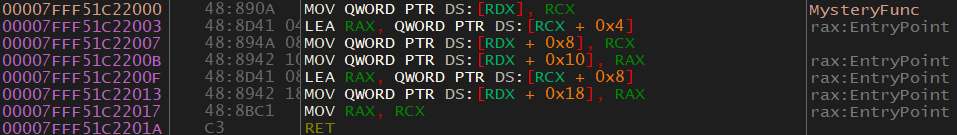 MOV QWORD PTR DS:[RDX], RCX- RDX looks like a pointer into some data structure because of how it’s being used. What I mean by this is that it’s being accessed with offsets (Ex. +0x8) which is an indicator of some sort of data structure. This could be an array or a class (or something similar). This code will move RCX (first parameter) into [RDX] (address pointed to by the second parameter). RDX is a pointer of some kind.LEA RAX, QWORD PTR DS:[RCX + 0x4]- Loads the address ofRCX + 0x4into RAX.MOV QWORD PTR DS:[RDX + 0x8], RCX- Move RCX (the first parameter) into RDX + 0x8.MOV QWORD PTR DS:[RDX + 0x10], RAX- Move RAX (the address of RCX + 0x4) into RDX + 0x10.LEA RAX, QWORD PTR DS:[RCX + 0x8]- Load the address of RCX + 0x8 into RAX.MOV QWORD PTR DS:[RDX + 0x18], RAX- Move RAX into RDX + 0x18.MOV RAX, RCX- RCX is moved into RAX as a return value. This tells us that this function returns a pointer to some structure. Note that this structure is also the second parameter. Oddly, it’s returning an unmodified parameter, but that’s how it is.