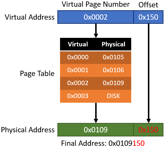 - 0x0002 will be looked up in the page table and it will be translated into 0x0109.